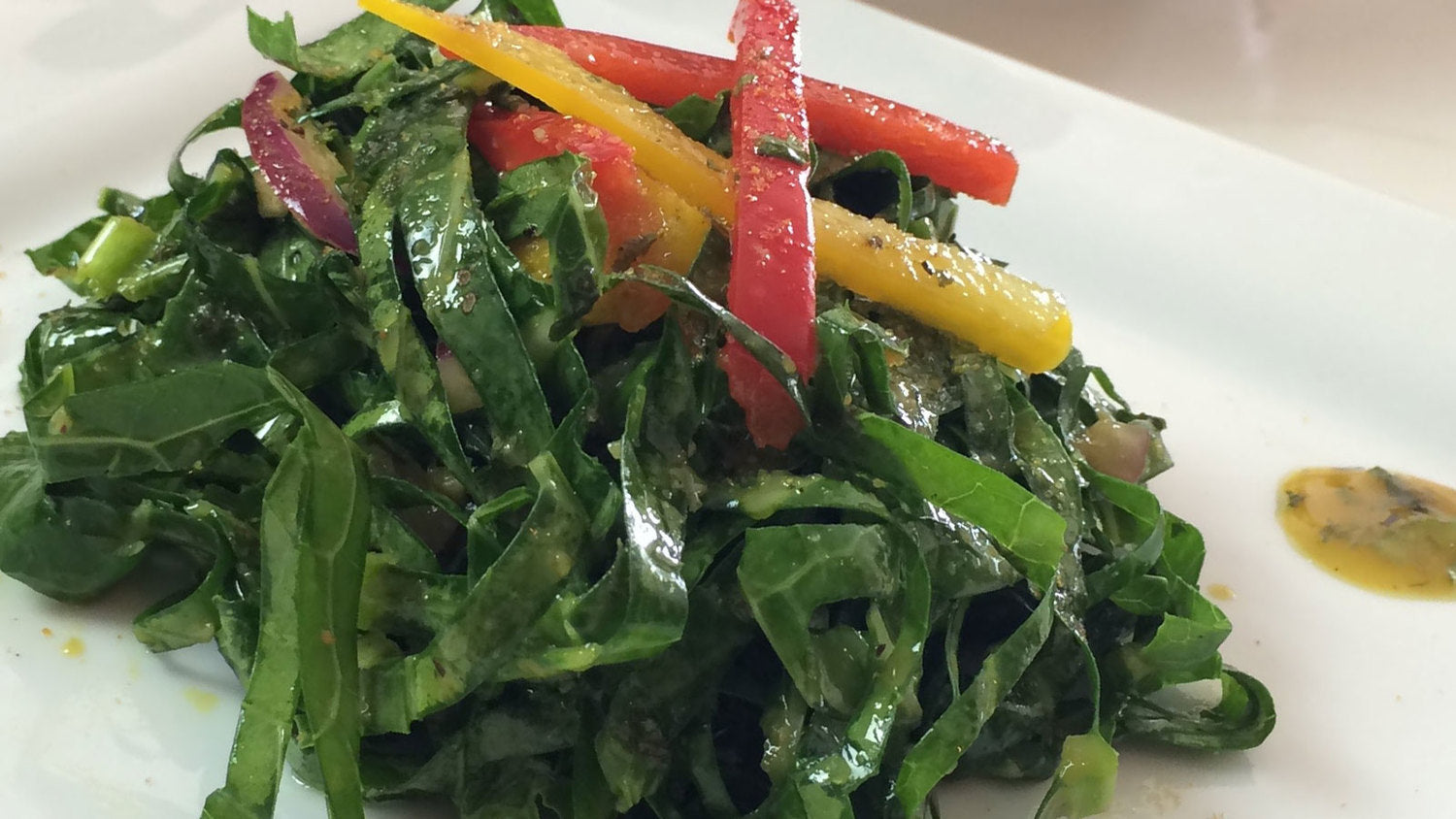 - In a large bowl add desired amount of thinly sliced collard greens, and lightly drizzle enough dressing to coat greens.