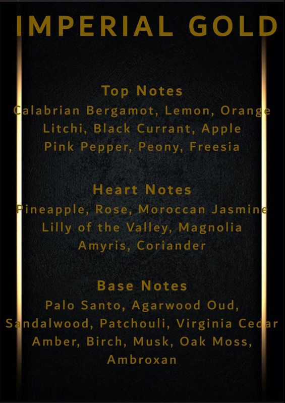 Each note unfolds like a secret, revealing layers of sensual desire and elegance. Imperial Gold is not just a scent; it’s an experience—one that captivates the senses and leaves an indelible impression. Elevate your presence and embrace the essence of true refinement with every alluring spray. This is not just a fragrance; it is a statement of your discerning taste and an invitation to savor life’s finest moments. Discover the extraordinary and make Imperial Gold your signature.